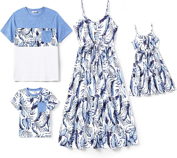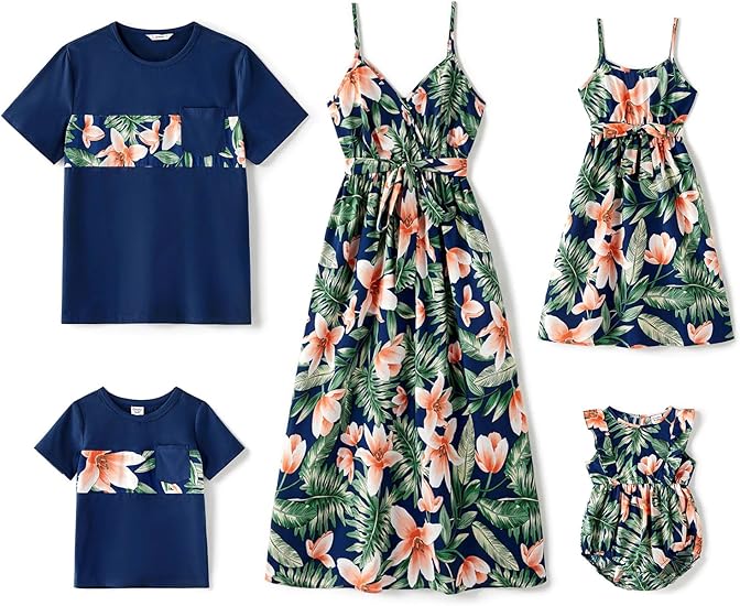 Family Matching Outfits Mommy and Me Dresses Hawaiian Tropical Vacation Beach Spaghetti Strap Dress and Shirt