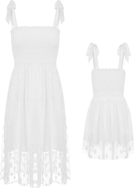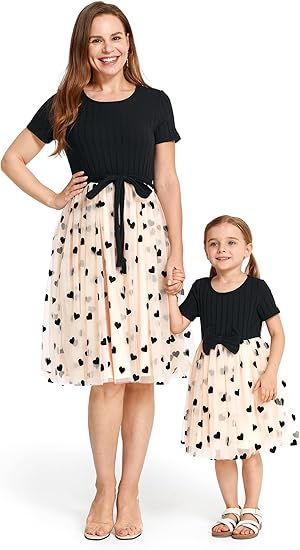 Mommy and Me Matching Short-Sleeve Cotton Solid Mesh Tulle Belted Long Dresses
