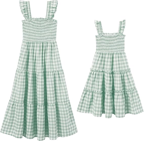 Mommy and Me Matching Dresses Plaid Midi Dress Summer Square Neck Ruffle Flowy Beach Mom Daughter Outfits
