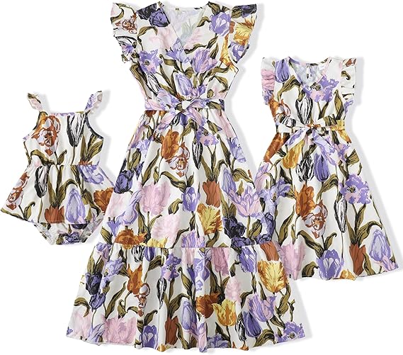 Mommy and Me Floral Printed Dresses Shoulder Straps Bowknot Chiffon Sleeveless Matching Outfits