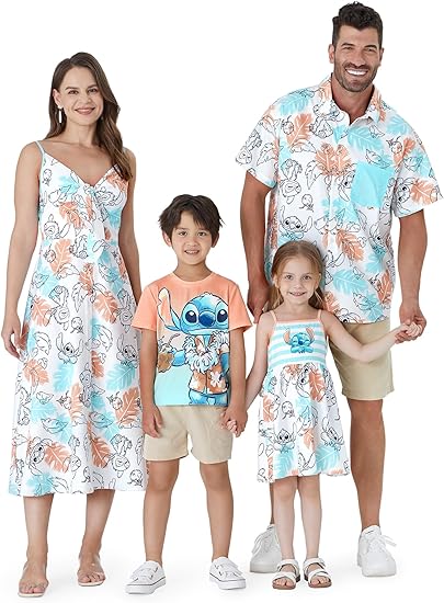 Stitch Matching Family Outfits Mommy and Me Cami Dress Hawaiin Summer Casual Sundress and Botton Down Shirts Set Blue